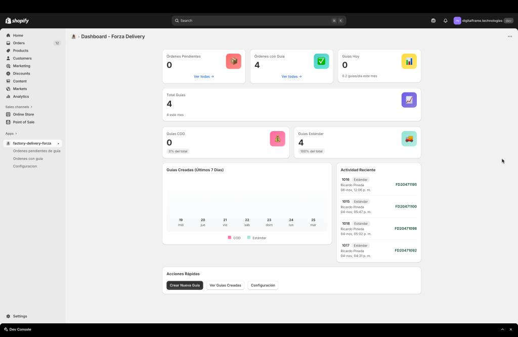 Sí. Factory Delivery se integra directamente con IUNGO, Forza y Cargo Expreso. Solo debes activar tus credenciales dentro de Shopify y el sistema quedará listo para generar envíos sin salir del panel. Además, seguimos desarrollando nuevas integraciones según la demanda del mercado.