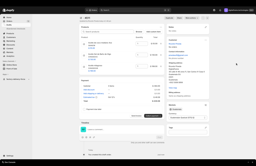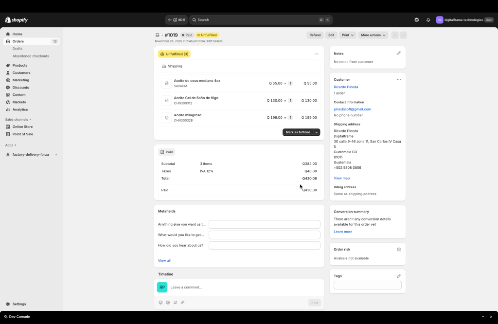 El plugin detecta las órdenes listas para enviar y completa los datos automáticamente. Desde el panel de Shopify puedes elegir el operador, ver tarifas en tiempo real, generar la guía en segundos y descargar el PDF. Todo queda registrado en un historial, sin usar plataformas externas.